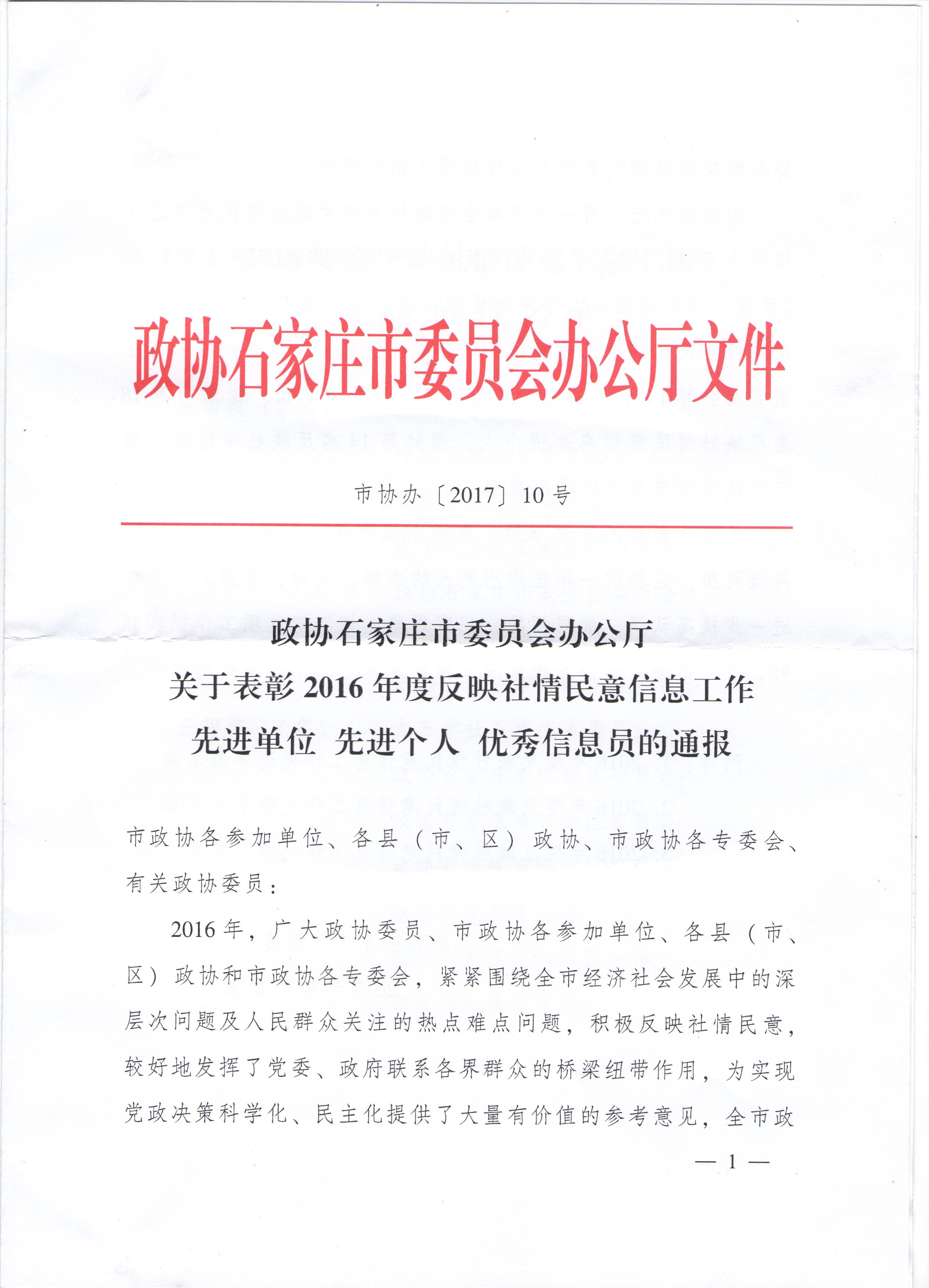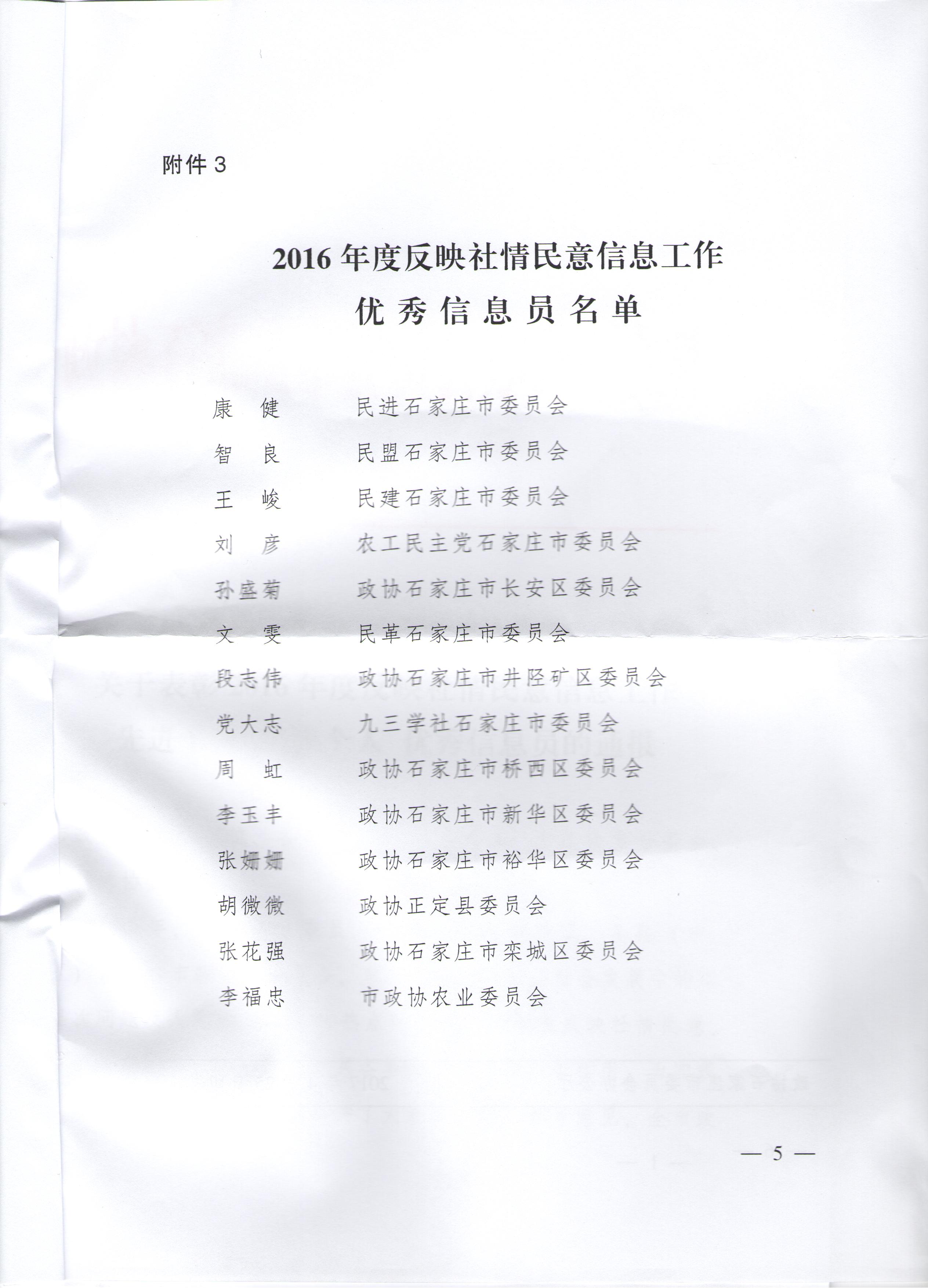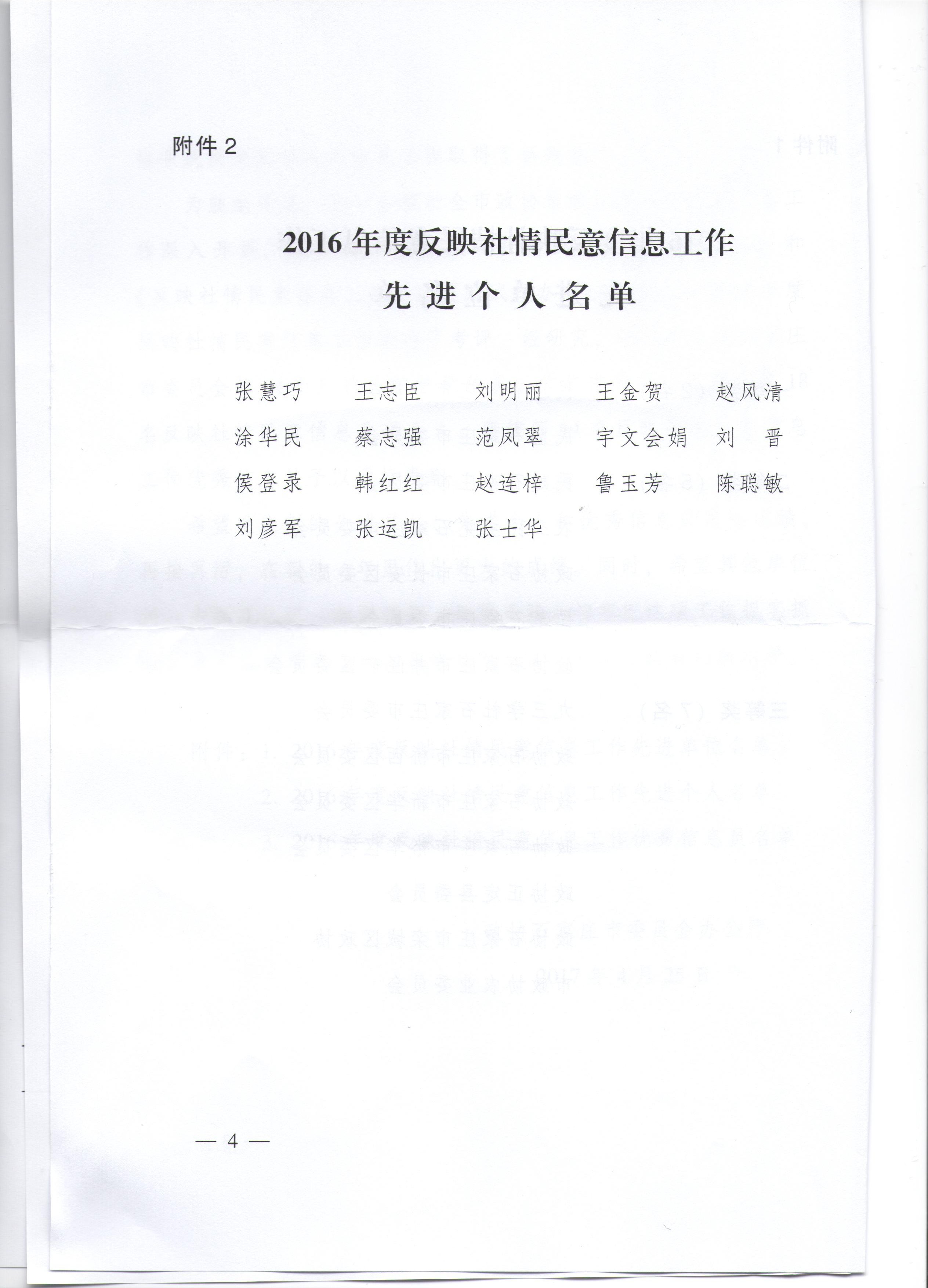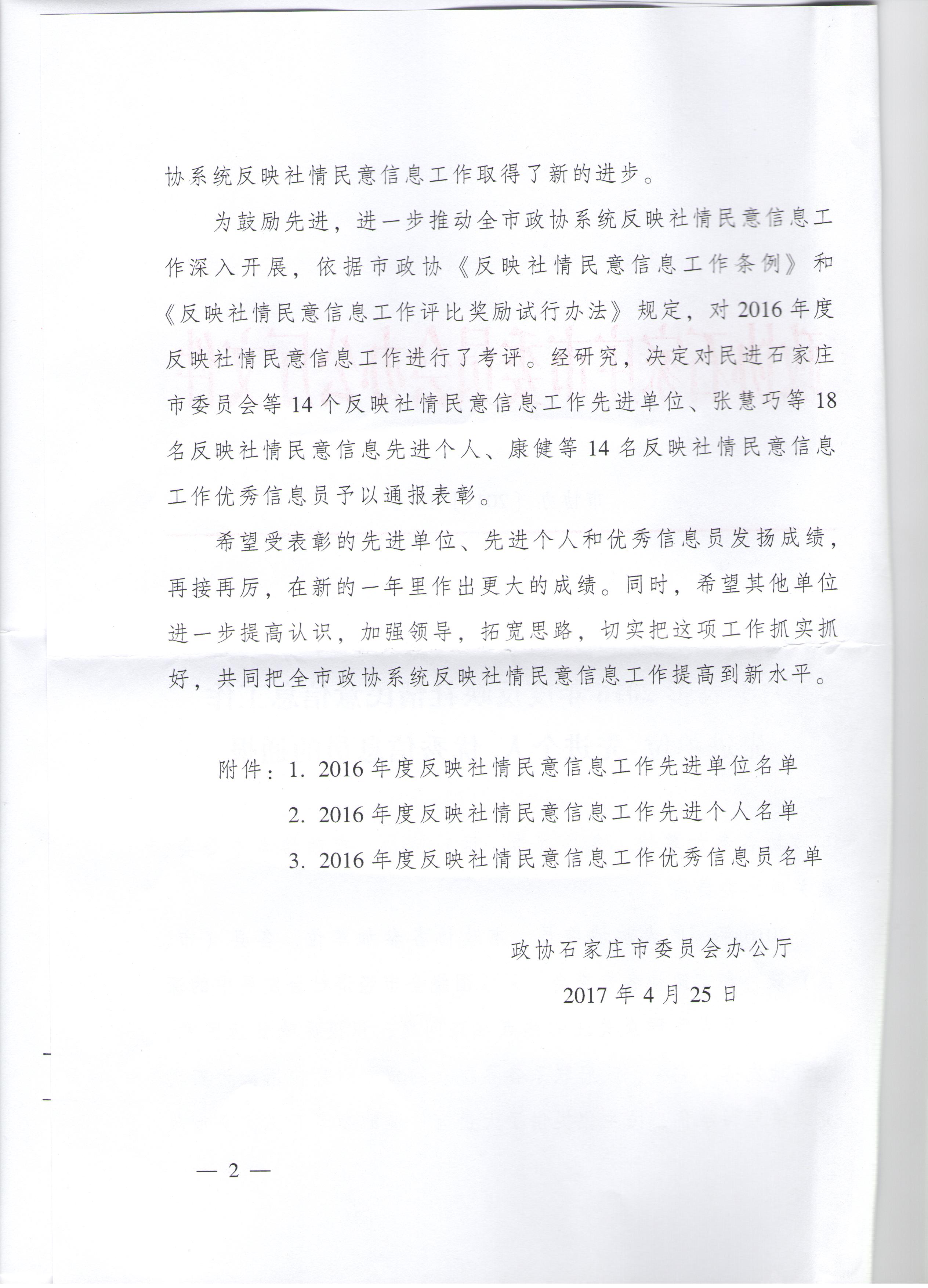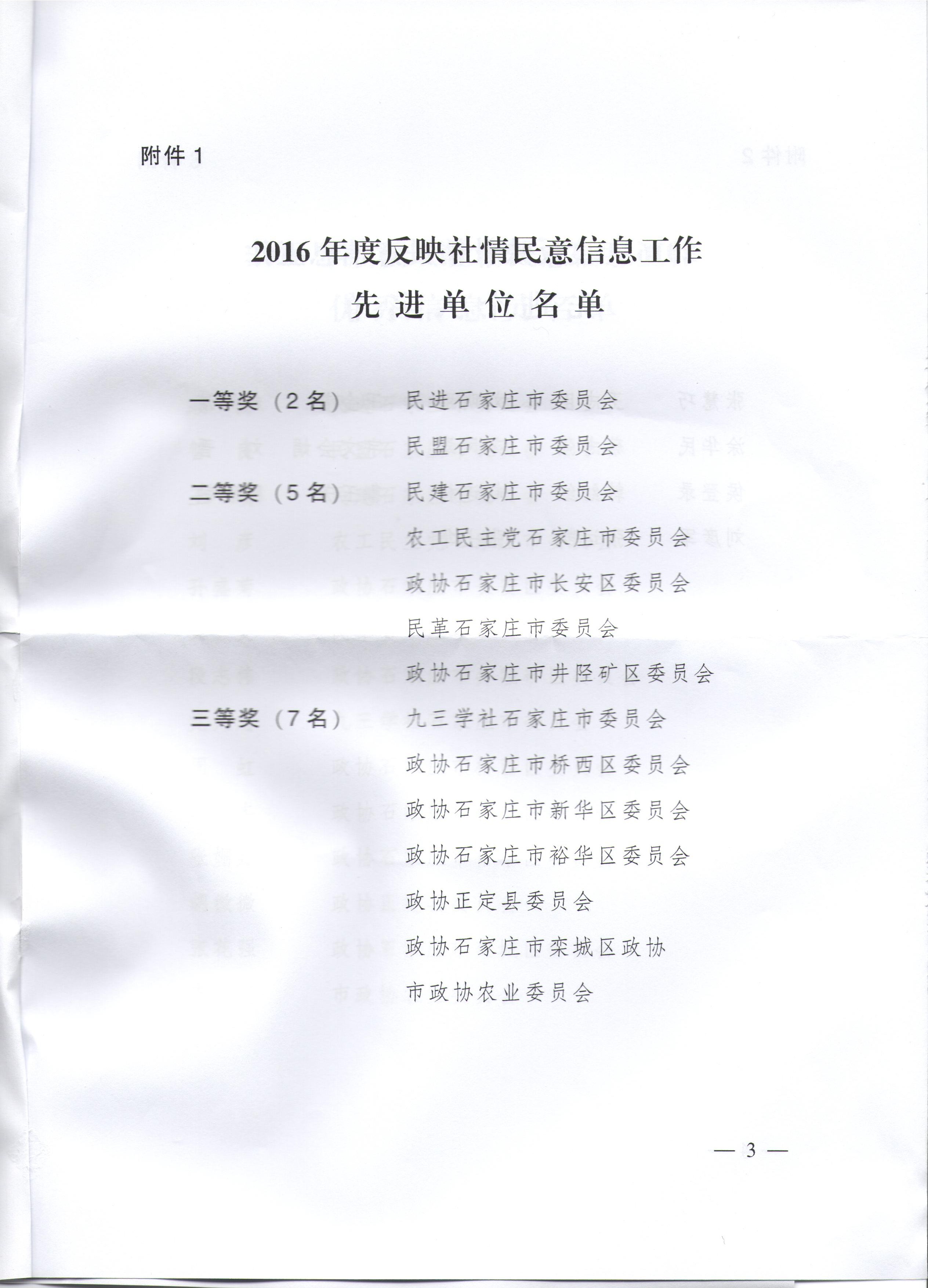 2016年度,我会社情民意工作取得优异成绩,在市政协开展的各项评比工作中名列前茅,获“2016年度反映社情民意信息工作先进单位一等奖”。张运凯、张慧巧、王志臣、刘明丽获“2016年度反映社情民意信息工作先进个人”称号,康健获“2016年度反映社情民意信息工作优秀信息员”称号。